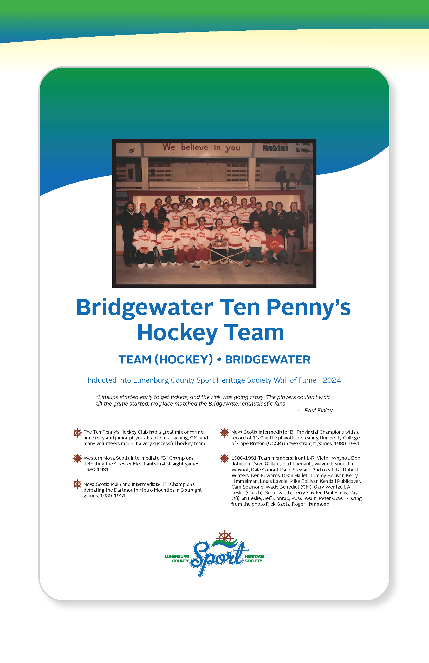 Bridgewater Ten Pennys (1980-81) TEAM (Hockey)Inducted into the Lunenburg County Sport Heritage Wall of Fame – 2024 Share this: Click to share on X (Opens in new window) X Click to share on Facebook (Opens in new window) Facebook Like Loading...