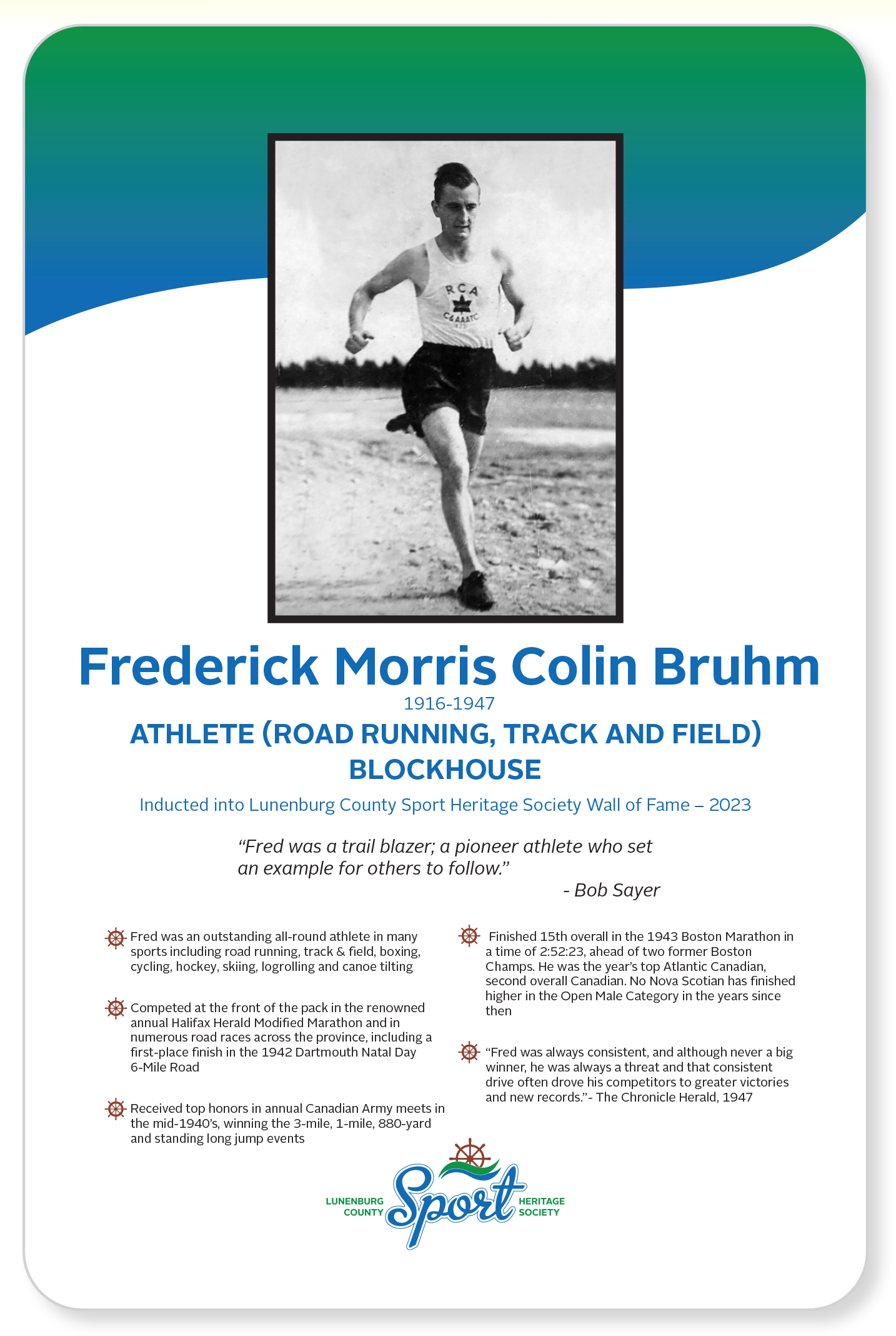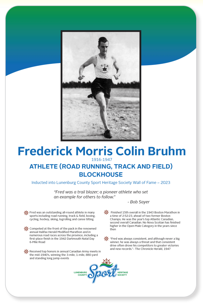 Frederick Bruhm ATHLETE (Road Running, Track and Field)Inducted into the Lunenburg County Sport Heritage Wall of Fame – 2023 Share this: Click to share on X (Opens in new window) X Click to share on Facebook (Opens in new window) Facebook Like Loading...