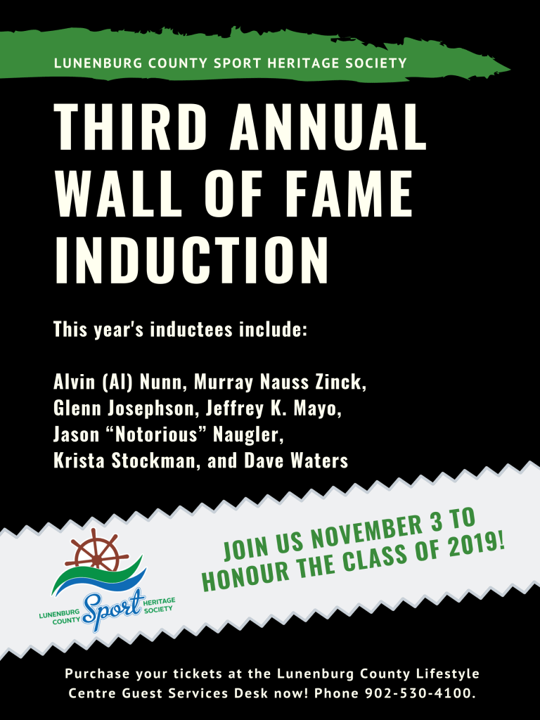 The third annual Lunenburg County Sport Heritage Society Wall of Fame induction was held on Sunday, November 3, 2019, at the Lunenburg County Lifestyle Centre in Bridgewater, Nova Scotia.