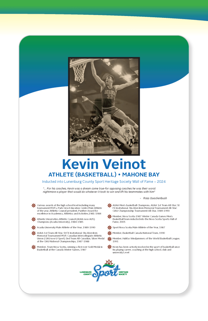 Kevin Veinot ATHLETE (Basketball)Inducted into the Lunenburg County Sport Heritage Wall of Fame – 2024 Share this: Click to share on X (Opens in new window) X Click to share on Facebook (Opens in new window) Facebook Like Loading...